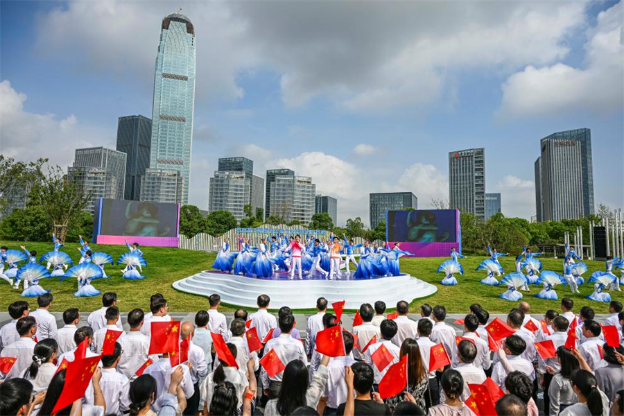 Photo taken on Sept. 14, 2023, shows the beginning ceremony during the torch relay of the 19th Asian Games in Taizhou, east China's Zhejiang Province, Sept. 14, 2023. (Xinhua/Sun Fei)