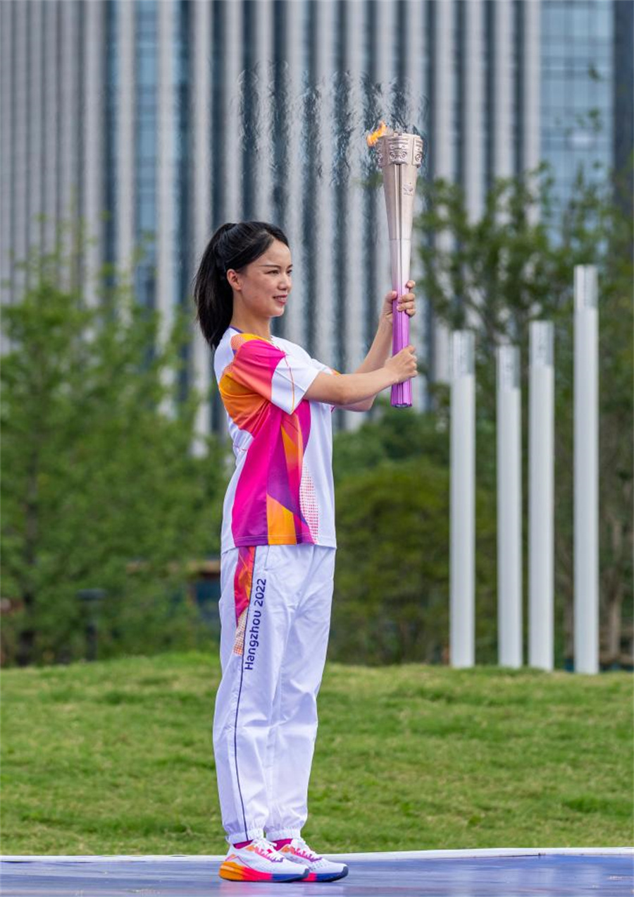 Torch bearer Wei Mengxi holds the torch during the torch relay of the 19th Asian Games in Taizhou, east China's Zhejiang Province, Sept. 14, 2023. (Xinhua/Sun Fei)