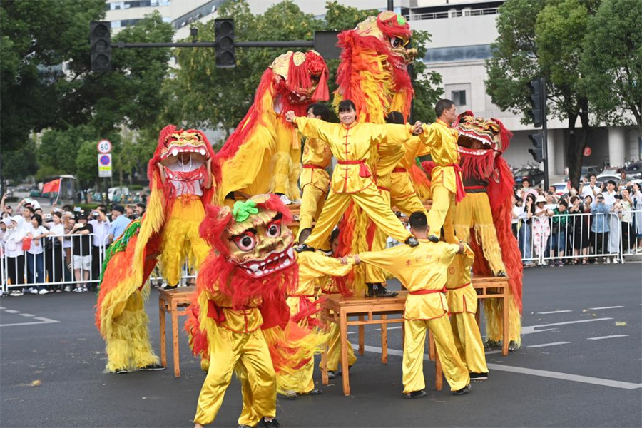 Lion dancers perform during the torch relay of the 19th Asian Games in Taizhou, east China's Zhejiang Province, Sept. 14, 2023. (Xinhua/Huang Zongzhi)