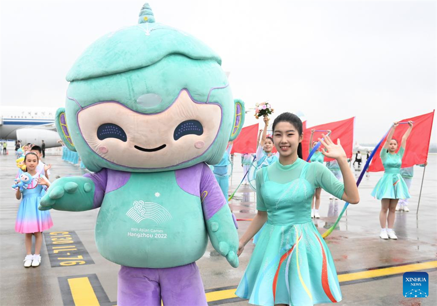 A welcoming ceremony is held upon the arrival of Syrian President Bashar al-Assad in Hangzhou, capital city of east China's Zhejiang Province, Sept. 21, 2023. Bashar on Thursday arrived here to attend the opening ceremony of the 19th Asian Games. (Xinhua/Huang Zongzhi)