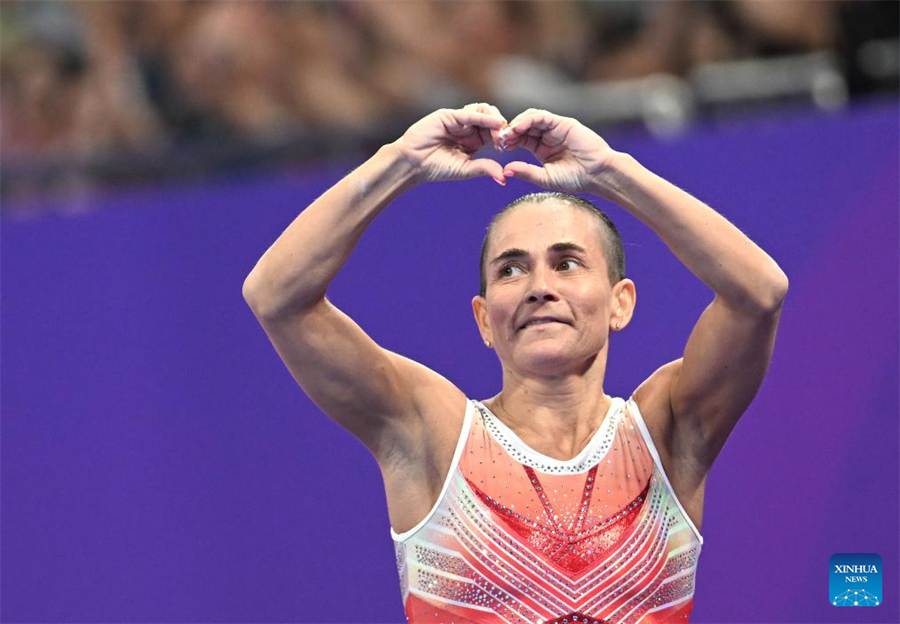 Oksana Chusovitina of Uzbekistan acknowledges the spectators after competing in the Vault of Artistic Gymnastics Women's qualifications and team finals at the 19th Asian Games in Hangzhou, east China's Zhejiang Province, Sept. 25, 2023. (Xinhua/Cheng Min)