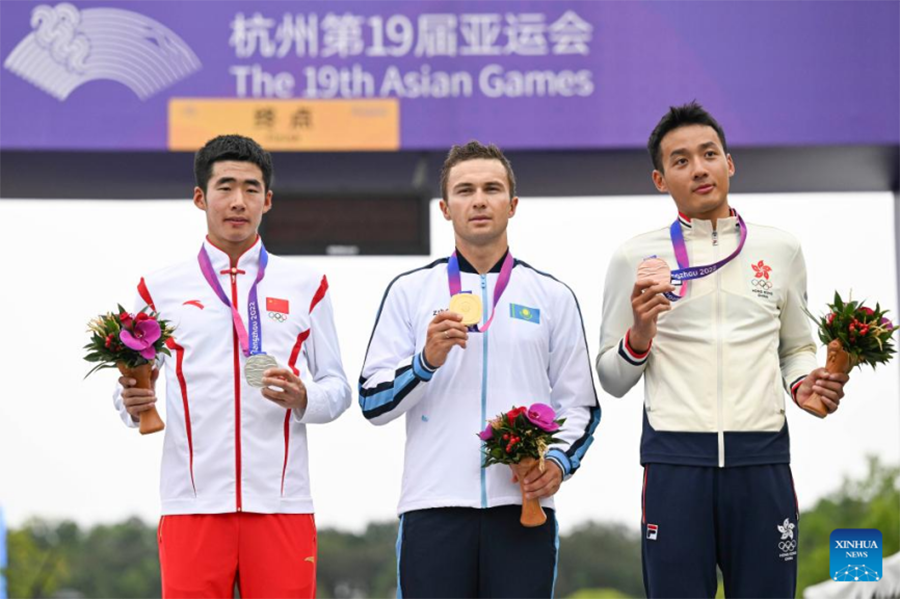 Gold medalist Alexey Lutsenko (C) of Kazakhstan, silver medalist Xue Ming (L) of China and bronze medalist Lau Wan Yau Vincent of Hong Kong, China, Men's Individual Time Trial of Cycling Road, the 19th Asian Games in Chun'an County, east China's Zhejiang Province, Oct. 3, 2023. (Xinhua/Hu Huhu)
