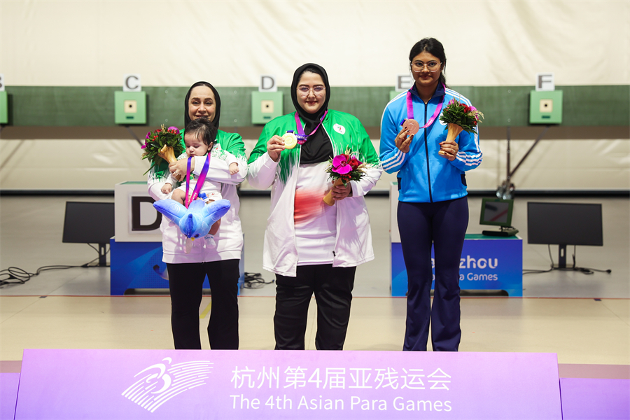 10月24日下午,在富阳银湖体育中心举行的射击(P2)SH1级女子10米气手枪决赛中,伊朗选手法泽·艾哈迈迪和萨雷赫·贾万马尔迪分获金、银牌,印度选手鲁比娜·弗朗西斯取得铜牌。