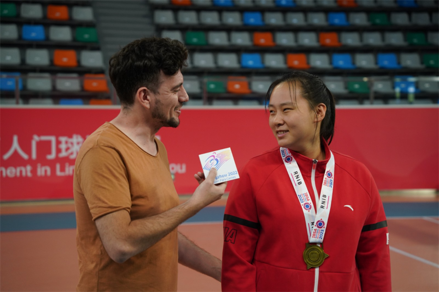 “非常开心!这是对我们这几年的训练和为这次比赛付出的所有人一个最好交代。”女子盲人门球队中锋、浙江队成员许淼对“亚运国际播报团”成员袒露心扉。