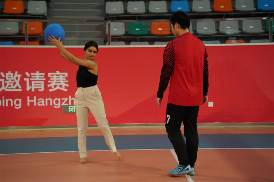 来自杭州师范大学的摩洛哥籍留学生麟后(Mdini Maria)平时喜欢各项运动,在体验后也对这颗集“篮球、足球和保龄球”特性于一体的球有了全新理解。它不重,但想要真正掌握投球诀窍并非易事。麟后在体验中首先进行了大量听力感受。“我的小教练在每次击球前都会让我仔细听门球里铃铛的声音,我的听力也得到了大量锻炼。随后我学习了击球动作,在教练的指导下完成了击球步伐的训练!”