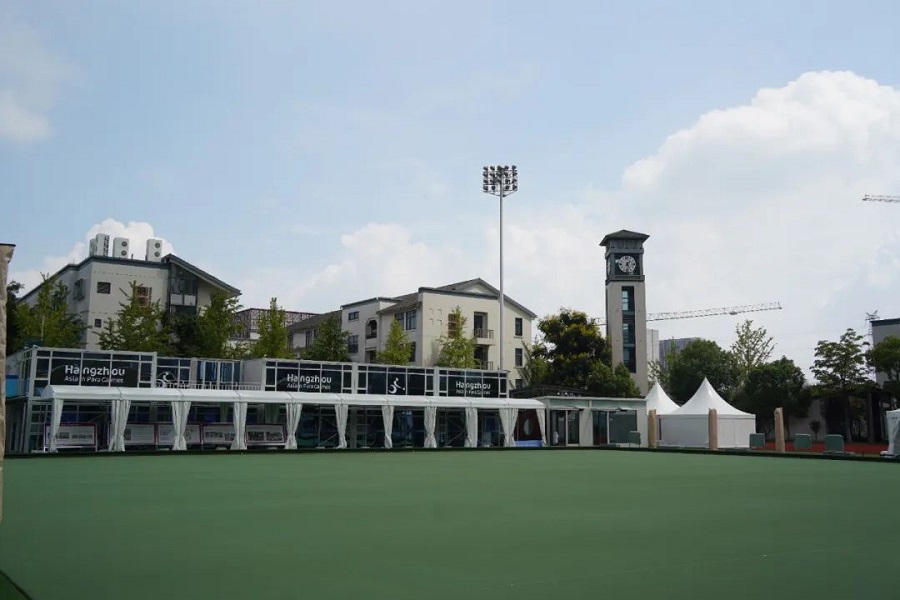 杭州文汇学校草地掷球场是杭州第4届亚残运会独立竞赛场馆之一,也是亚残运会历史上第一个由基础教育学校操场改建而成的竞赛场馆,赛时将承担亚残运会草地掷球比赛项目,参加该项目比赛的选手为肢体残疾和视力残疾的运动员。本届亚残运会草地掷球项目设置了男单、女单、混合3个小项,预计24枚金牌将从这片场地上产生。