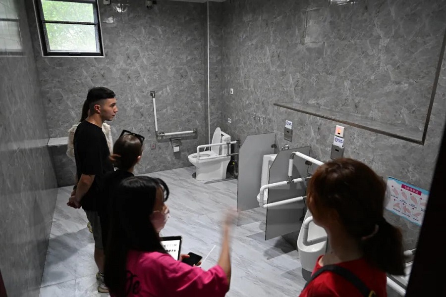 播报团成员们还实地感受了设在教学楼里“会说话”的无障碍卫生间,里面所有的设备都根据残障人士的实际需求设置,非常贴心。来自乌兹别克斯坦的播报团男生孙奕天(SHAKIROV AMAL)体验了人性化的互动语音助盲功能后连连感叹:“杭州为无障碍城市打造真的做了很多的努力,甚至连公共卫生间的小细节都考虑到了,设备精良!”