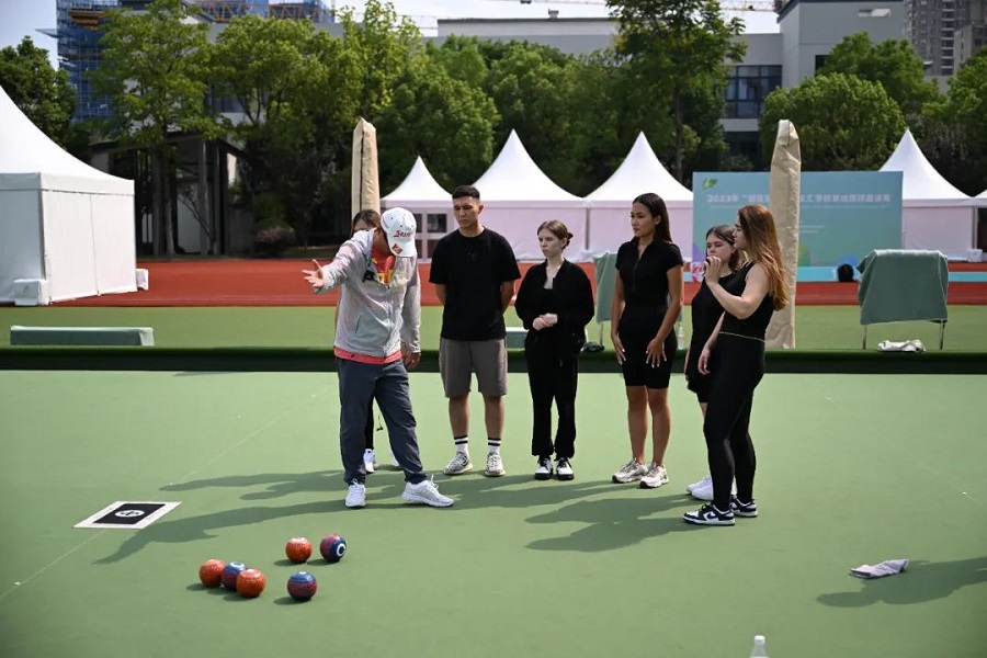 “比赛规则其实有点像冰壶。” 面对外籍播报员的好奇,刘教练拿出一个白色小球开始详细演示,“这个是目标球,在比赛中,我们的球都需要接近这个目标球,离它越近,我们就越能得分。”
