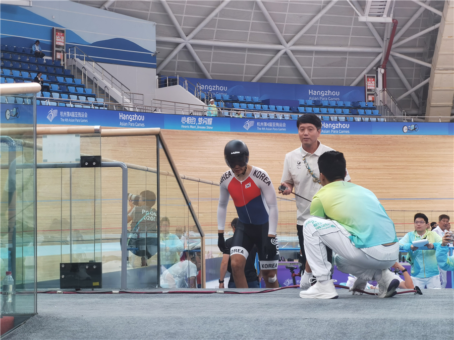 10月25日,在杭州淳安界首体育中心举行的亚残运会场地自行车赛事圆满收官。比赛中,中国队摘得24枚奖牌,战绩骄人。赛场上,志愿者“小青荷”和自行车运动员同场“竞速”的故事,同样精彩。
