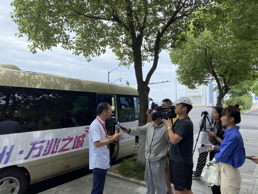 在奥体中心5号门,坐上浙江移动的万兆精品路线体验车,车载电视实时显示着车辆位置和实测网速。随着工作人员按下测速按钮,网速一下子就飙过了10Gbps,相比5G千兆体验提升了10倍。随着车辆行驶,网络速度有所波动,但也稳定在5Gbps以上。而在电视屏幕上,5G-A站点就像在接力赛跑,为体验车提供不间断的极速的网络服务。