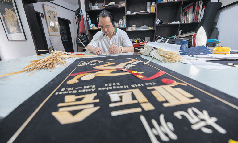 朱军民用一双巧手,创作亚运题材麦秆画艺术作品,表达对杭州亚运会的期盼。