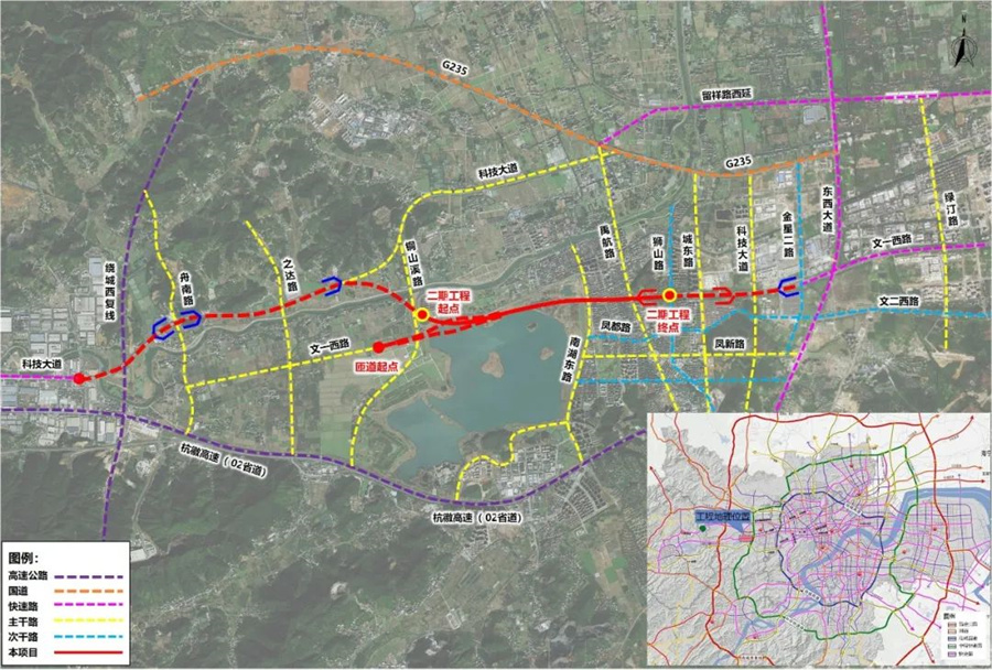 项目位于杭州市余杭区,总用地面积约133.33亩,项目西起南湖圩堤北6#盾构井,东至狮山路,分为快速路系统和地面主干路系统两部分,全长约3.6公里;另设置一对定向匝道接南湖小镇已建科创大道,全长约1.6公里。建设工期为2023年-2026年。
