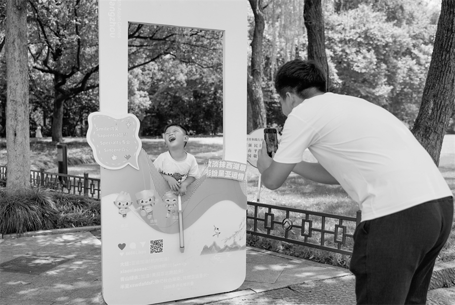 夏日炎炎,西湖边的西子驿•柳浪闻莺志愿服务微笑亭旁,有一个造型可爱的亚运打卡框,上面画着“亚运三小只”,路过的大人和小孩纷纷停下脚步,在镜头前开心地与亚运同框合影。