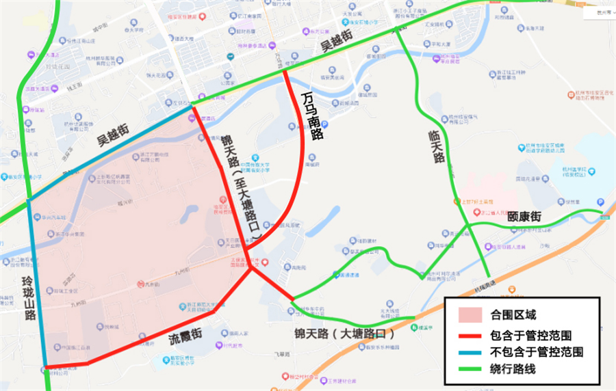 玲珑山路(不含)、流霞街(含)、锦天路(至大塘路口)(含)、吴越街(不含)合围区域内所有道路以及万马南路,24小时禁止工程运输车辆及其他黄牌货车、危化品运输车通行。