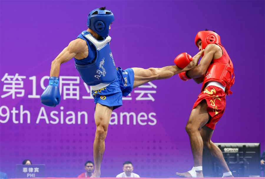 2023年9月28日,杭州第19届亚运会武术男子散打56公斤级决赛举行。中国对阵菲律宾,中国队选手江海东(左)在比赛中。