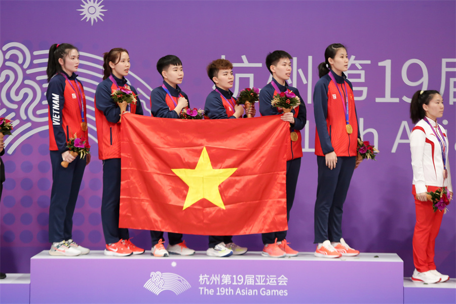 2023年10月4日,杭州第19届亚运会藤球女子四人比赛颁奖仪式举行。越南队获得冠军。