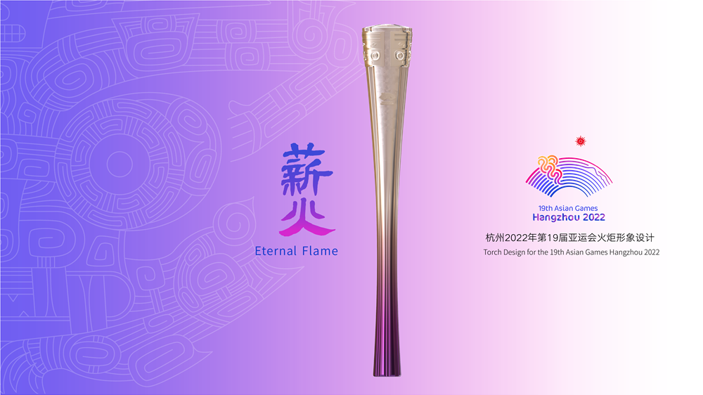 “薪火”,表达了各国运动员的团结共融。火炬四面八槽,聚合至顶部中心@形象,以生命之河的形式象征各国家和地区运动员汇聚杭州共襄盛事,呼应了本届亚运会“心心相融,@未来”的主题口号;炬身纹样以中国结穗尾结束,以东方元素展现着亚运大舞台上的团结共融,也寄托着面向未来,共建人类命运共同体的良好愿望。