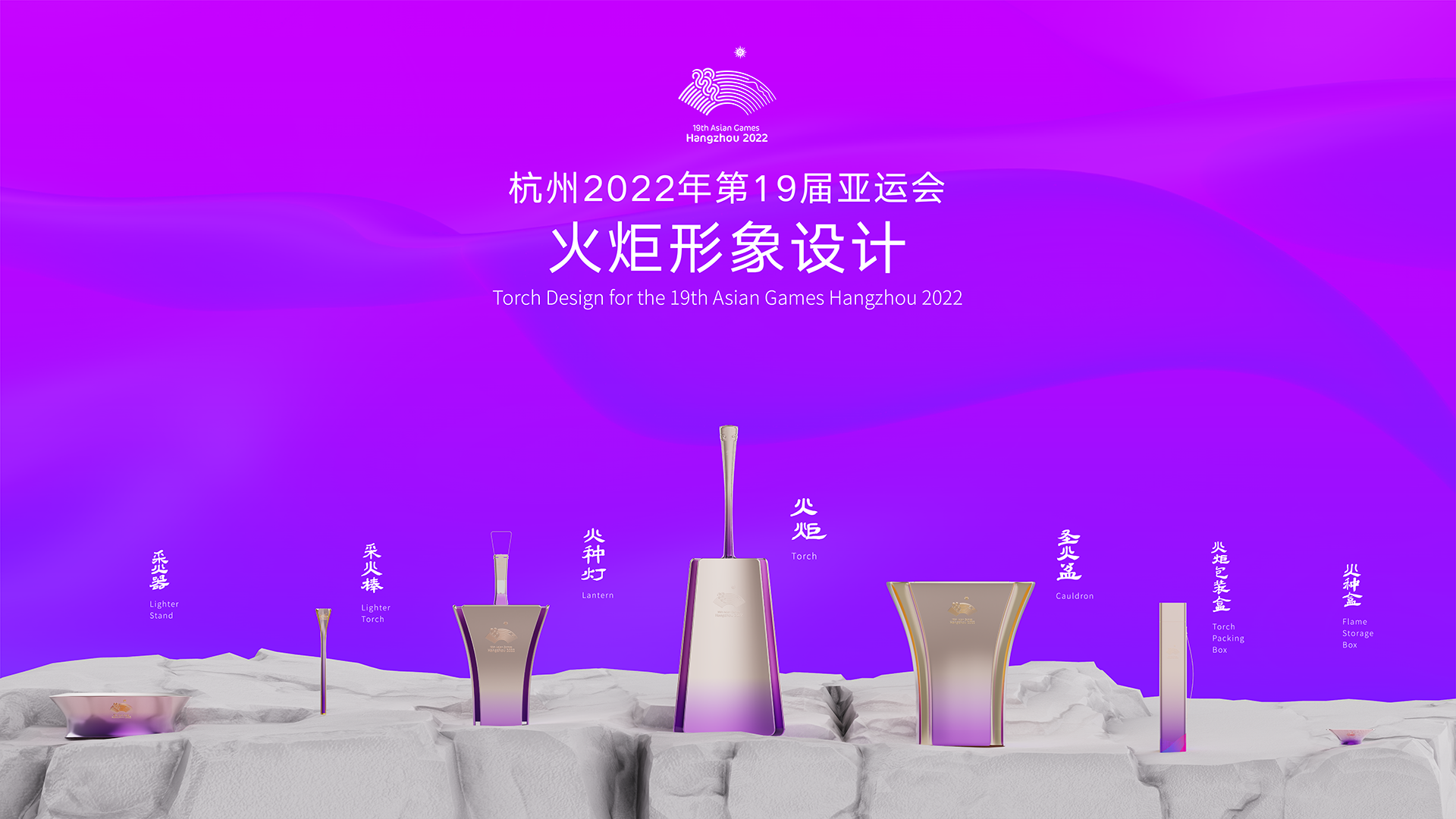 火炬造型自下而上“生长”,整体高730毫米,净重1200克。炬基,以八条水脉为文明之脉,代表浙江八大水系;炬身,以良渚螺旋纹为演化,形似指纹,自然交织,精致细密;炬冠,以玉琮语意为特征,方圆相融,昂然而立;出火口设计源自“琮”最早的甲骨文字形,寓意“光在内周而复始”;整体轮廓曲线犹如手握薪柴,在动静之中迸发出由外向融合的运动员力量感和汇聚态势。