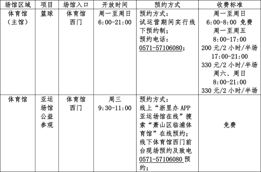 还有一个好消息!为进一步满足广大体育运动爱好者的健身需求,让市民群众共享亚运红利,临浦体育馆(主馆)4片篮球半场及亚运场馆公益参观于昨日起面向市民试运营开放。赶紧约起来~