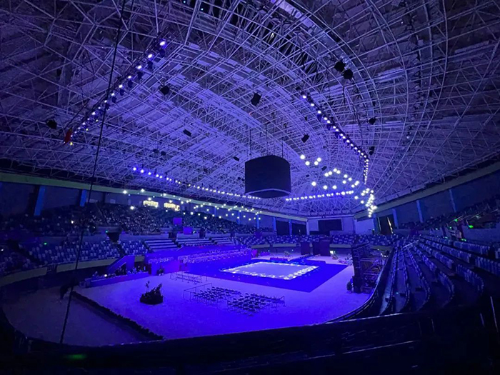 现场灯光暗下来,体育馆顶棚的100套组合灯球错落起伏,随着音乐变换色彩,场地中间也亮起了绚烂的灯光效果,现场氛围营造效果一流。