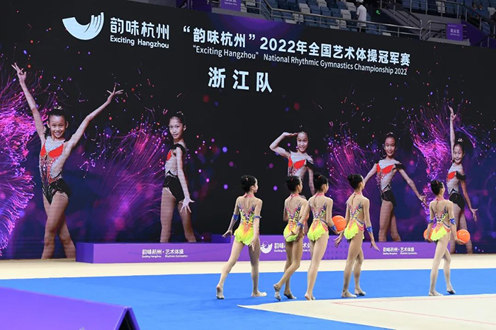 这就是一场视听盛宴!8月23日下午,“韵味杭州”2022全国艺术体操冠军赛在黄龙体育中心体育馆正式开幕。