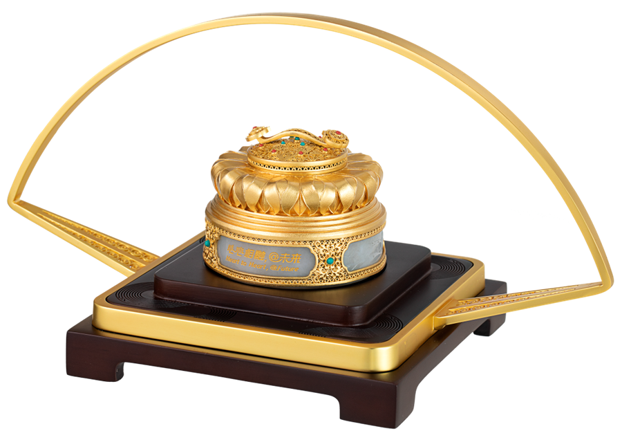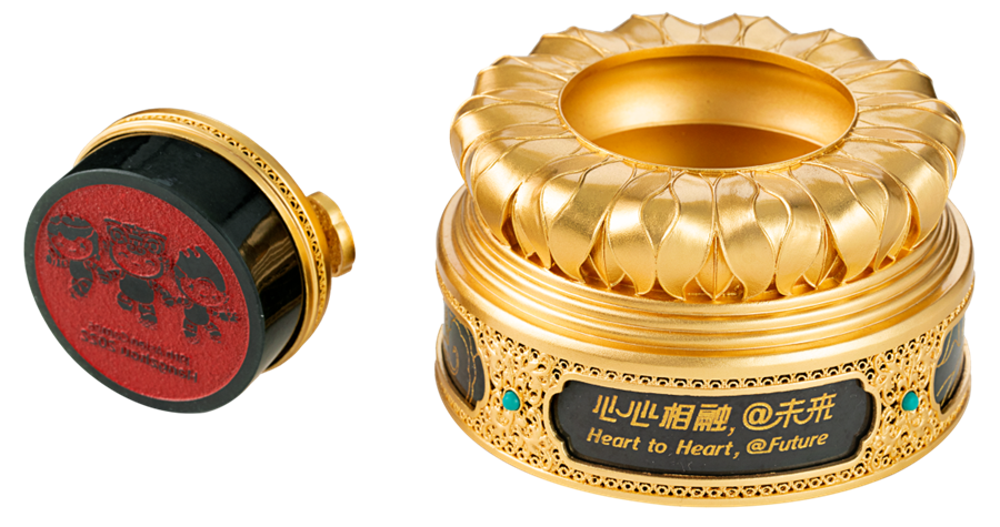 国逢大事必以重器铭记,印玺承载了从古至今信义之邦的道德坚守,象征着我国将秉承公平公正原则奉献一场精彩亚运盛会。亚运融合·中国印以杭州奥体中心“大莲花”为造型主体,以印玺形式为文化载体,通过融入玉雕、錾刻、花丝镶嵌三大非遗技艺美学元素,展现包含了亚运会会徽、吉祥物、杭州的三大世界遗产(良渚古城遗址、京杭大运河、西湖)、杭州奥体中心体育场(大莲花)等七大亚运元素,以传承创新理念制作而成的,具有文化价值、收藏价值和历史价值的杭州亚运会特许商品。