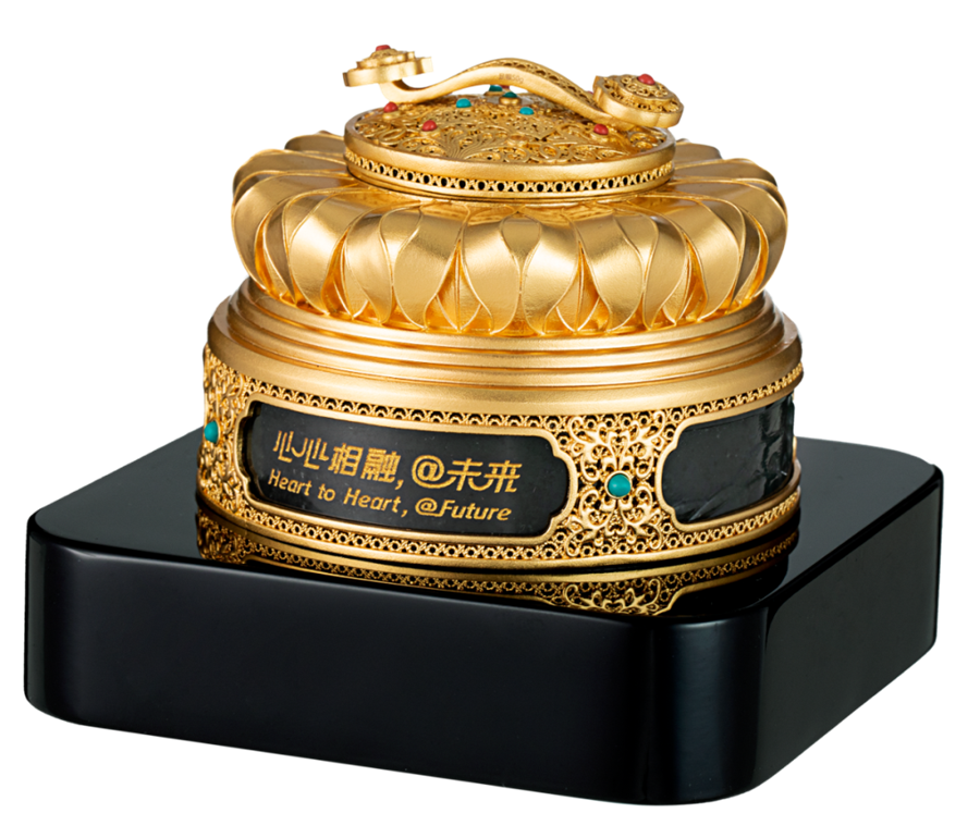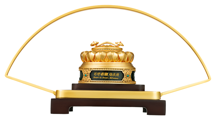 亚运融合·中国印由北京工艺美术大师郭鸣领衔设计,与中国工艺美术大师吴元全、王树文、冯道明以及国礼设计团队共同创作。整体采用金玉融合的方式,金为顶,玉为基,上下融合,分为如意花丝印、莲花造型金镶玉印玺两部分,两个印玺分别可钤印出杭州亚运会吉祥物和亚运会会徽。印玺底座四面开光,正面展现杭州亚运会主题口号——“心心相融,@未来”。上下双印玺的花丝部分为卷草和莲花纹饰并镶嵌19颗宝石,代表第19届亚运会。产品整体呈“冠”的造型,寓意祝福本届赛事的运动健儿们勇夺桂冠,圆梦凯旋。