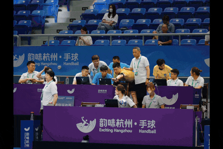 除此之外,场馆还在比赛中场休息时段增设了问答互动送礼物和幸运抽奖的环节。“近代手球发明者是谁”“第一届奥运手球比赛的举办地点在哪”等有关与手球相关的题目出现在大屏幕上,现场观众可通过参与答题互动赢得礼物,同时也更加自如地了解手球运动。“此次冠军杯赛的最终目的是按照亚运会手球比赛流程对场馆进行全方位演练,保证场馆设施在赛时达到最佳状态。”本次赛事裁判长吴瑞亭说道。