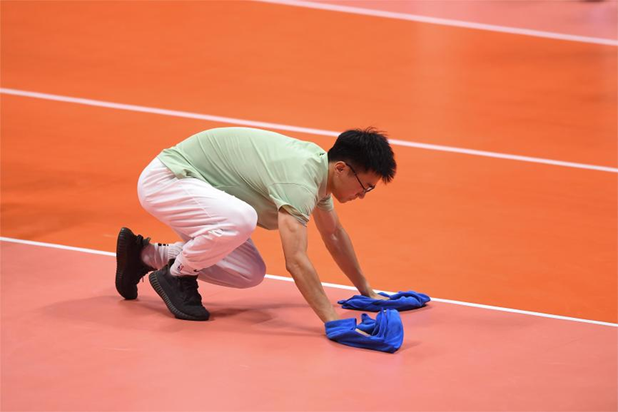 起身疾跑、单膝下蹲、双手擦拭,整套动作一气呵成,略带汗渍的地面立马恢复光泽。“一旦进场到达工作点位,我的注意力一定保持高度紧张,运动员倒地后要立马上场,绝不能被动等待裁判吹哨提示再跑去擦拭地板。”FOP区(赛时比赛场地)专业志愿者黄瑞说。