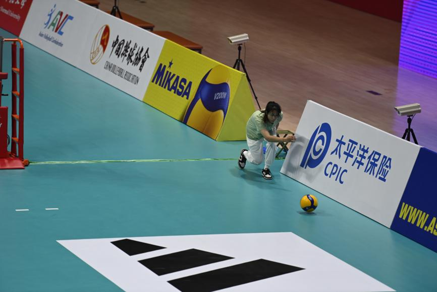 除了“快擦手”,FOP区场地分布6个点位的专业志愿者也很吸睛,他们被称为排球赛场上的“球童”。回合间隙、垫球出界、接球失误,一旦球落地成为“死球”,底线两个点位的捡球志愿者就要快速判断出运动员行走的方向,用地弹球的方式将球交给发球队员。其他点位的志愿者滚球、传递要及时、利落,动作要统一、规范。