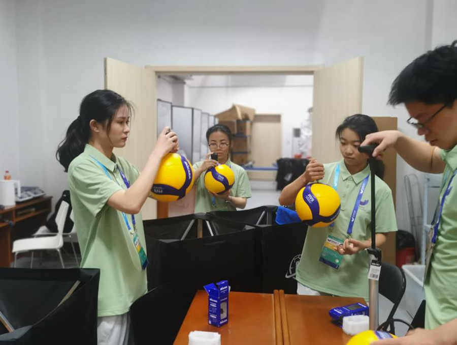 卢瑞瑞介绍,竞赛器材室配有6名志愿者,他们2人一组共分3组,其中一组负责检测准备排球数量及场上其他专业器材的准备,一组负责竞赛器材领用登记入库出库,另有一组专门负责为场上受伤运动员制冰。在服务于本次亚洲U16女子排球锦标赛前,他们曾接受为期一周的专业岗前培训,包括熟悉手动打气筒、排球讯响器、丈量尺、标志杆、制冰机这类专业器材等。