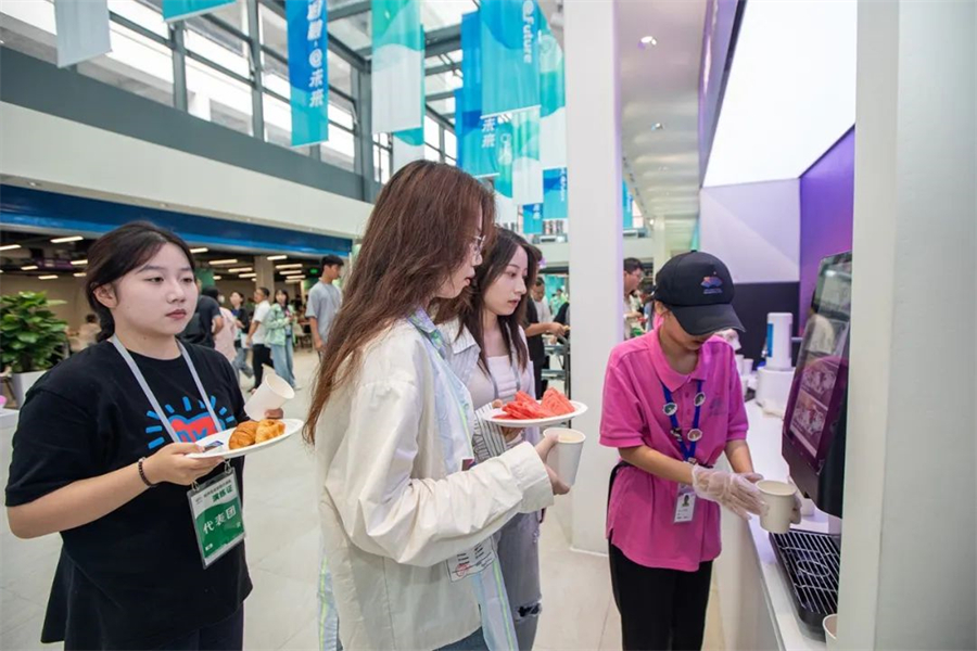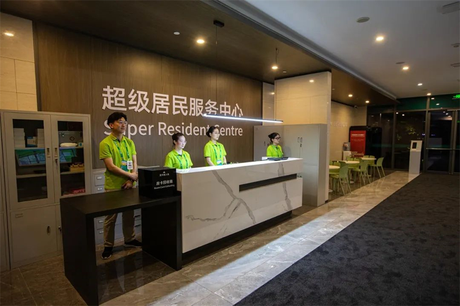 办完了相关手续,“小青荷”微微鞠躬,欢迎着我们到来,之后我们乘坐接驳车到达了住宿区域,这里的超级居民服务中心同样有“小青荷”在等待我们,耐心地帮我们指路。一旁同行的女士携带行李较多,一位“小青荷”男生立刻上前帮忙提起了行李,一路送到公寓楼下。