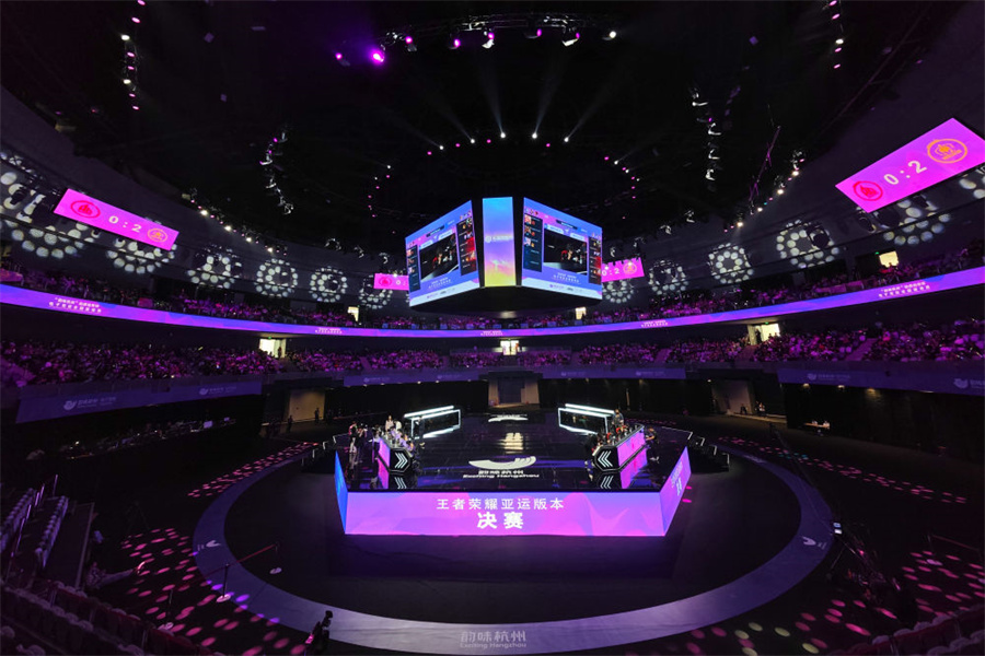 “我们采用了亚运会‘声、光、电’的高标准,为电竞及其衍生内容打开更丰富的想象空间。”工作人员邢小四指了指场馆顶端的六块端屏和193盏演艺灯说,这里不但可以营造出电竞比赛的科技感、未来感,也让不同角度的观众有全方位的视觉享受。