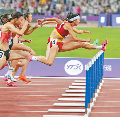 10月1日,杭州亚运会女子100米栏决赛,中国体育代表团选手林雨薇(右一)夺得金牌。新华社记者 孙非 摄