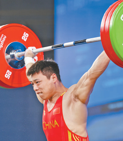 10月1日,杭州亚运会举重项目男子67公斤级比赛,中国体育代表团选手谌利军夺得金牌。新华社记者 杨磊 摄