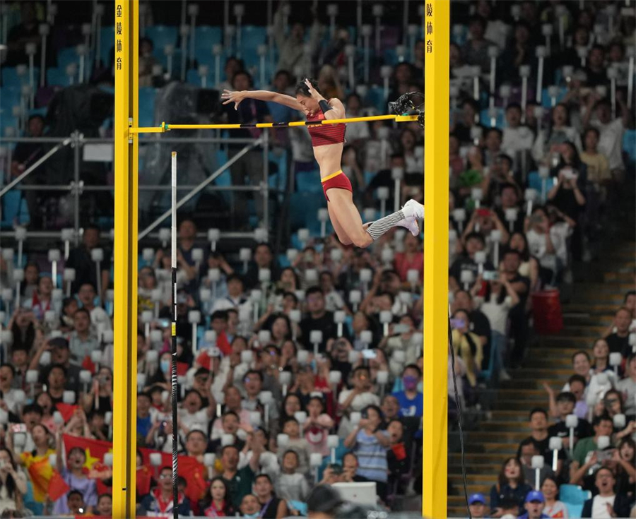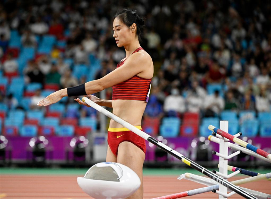 杭州奥体中心体育场,女子撑竿跳高项目最先开赛。这是一项赛时很长的项目,往往最早开场、最晚结束。