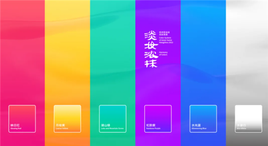 杭州亚运会色彩系统主题为“淡妆浓抹”,灵感出自宋代诗人苏轼的诗句“欲把西湖比西子,淡妆浓抹总相宜”,通过对中国色彩文化和杭州城市特质的提炼与浓缩,设计出以“虹韵紫”为主,以“映日红、水墨白、月桂黄、水光蓝、湖山绿”为辅的色彩系统,挥洒出既有葱郁湖山自然生态,又富创新活力运动激情的新时代杭城华彩画卷。